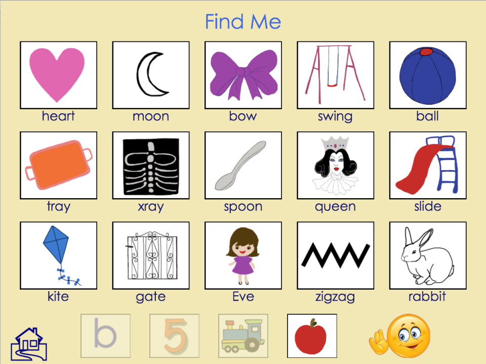 This game 'Find Me' focuses on listening to and remembering up to 4 items at a time. There is a choice between pictures (shown in this screen), the alphabet and numbers, shapes and colours.