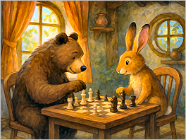 55. Two animals playing chess together in a cozy woodland room. The scene is colorful.
