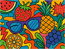 80. A vibrant pop-art collage featuring fruits, sunglasses, and funky shapes