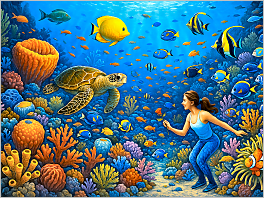79. An underwater coral reef scene teeming with colorful fish, turtles, and sea plants