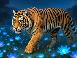 78. A majestic tiger walking through a field of glowing bioluminescent flowers at night