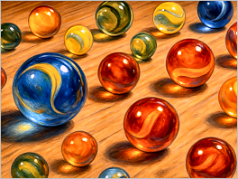 77. A photorealistic painting of multicoloured glass marbles on a wooden table