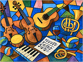 76. A Cubist-style still life with musical instruments and bright colors