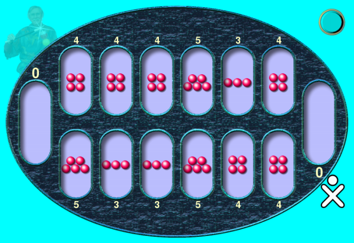Feb 21 I've just heard from OLPC Australia that Follow Me, Numbers and Tessellations have been included in their standard software builds. This means that every child in Australia will be receiving these activities. Very encouraging! Activity No 16 - MancalaFeb 25 This is one of my favourite games - very simple to play yet lots of careful thought, counting and planning required. Mancala is often played in remote villages - the dishes are simply holes in the sand and the pieces are stones. It is a two-person game so the player gets to play against me. That's not as one-sided as you may think because my program deliberately doesn't use any look-ahead. Anyway, here's what it looks like so far: this is at the start of a game.