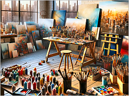 125. Here's the latest creation: A photorealistic medium shot of an artist's studio, showcasing canvases, brushes, paints, and a glimpse of the city skyline through a large window, reflecting a burst of creative activity inspired by urban life.