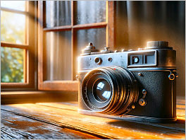 124. I've created a photorealistic medium shot of a vintage camera resting on an old wooden table, with morning light streaming in through an open window, highlighting a serene garden in the background.