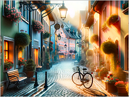 123. A quaint cobblestone street in a sleepy European village at dawn, with the early morning light highlighting colorful buildings and a solitary bicycle.