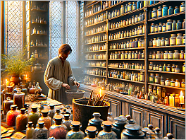 121. A photorealistic medium shot of an old-fashioned apothecary shop, filled with jars and bottles of colorful potions and dried herbs. The shopkeeper adds to the ambiance of mystery and ancient knowledge, with dim light filtering through stained glass windows.