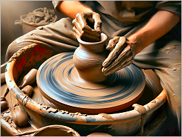 100. A potter's wheel in action with the potter's hands skillfully shaping a clay vase. The dynamic movement of the wheel and the artistic surroundings of splattered clay and tools make for an engaging scene.