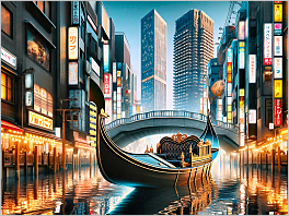 98. A grand Venetian gondola is depicted navigating the neon-lit streets of Tokyo, creating a striking contrast between the traditional and the modern urban setting. This surreal scene blends the charm of Venice with the dynamic energy of Tokyo.