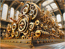 97. Here's an image capturing the theme of "incredible machines or devices": A vast and intricate clockwork mechanism, housed in a grand steampunk-style hall, complete with gears, cogs, brass pipes, and steam vents. The design and setting create an industrial yet fantastical aesthetic.