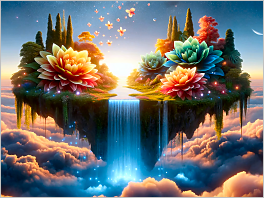 96. A dream sequence with a floating island in the sky, lush with vibrant, oversized flowers and a sparkling waterfall. The sky transitions from day to night below the island, adding a surreal and captivating touch to the scene.