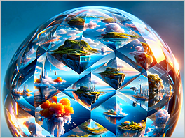 95. A photorealistic close-up of a crystal sphere reflecting and refracting multiple surreal landscapes within its facets. This crystal sphere presents a range of vibrant scenes, from underwater cities to floating islands, offering a mesmerizing visual paradox.