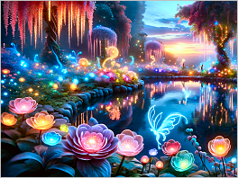 91. Here's an enchanting garden scene at dusk, featuring flowers that emit a bioluminescent glow. The centerpiece is a crystal-clear pond reflecting the colorful lights and the twilight sky, while ethereal creatures like glowing butterflies add to the garden's mystical charm.