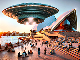 164. An alien spacecraft landing on the forecourt of the Sydney Opera House.