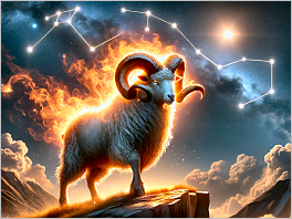65. Photorealistic medium shot of Aries, depicted as a majestic ram with golden fleece, standing atop a cliff with a fiery aura surrounding it. The backdrop is a night sky with the constellation of Aries shining brightly.