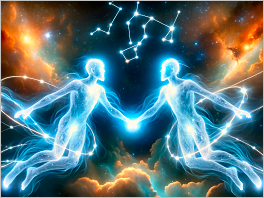 64. Photorealistic medium shot of Gemini, depicted as ethereal twins intertwined with a glowing bond. They float against a cosmic backdrop where the constellation of Gemini shines, and their forms radiate a celestial light.
