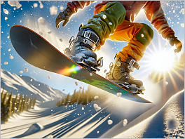 63. Photorealistic close-up shot of a snowboarder mid-jump, with snow crystals trailing behind and the sun creating a halo effect around them. The bright colors of the snowboard and the rider's outfit pop against the pristine white of the snow-covered mountain.