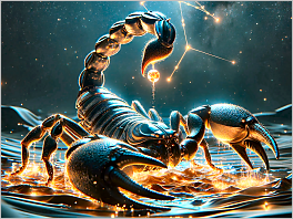 62. Photorealistic medium shot of Scorpio, depicted as a majestic scorpion with a tail that sparkles like a constellation. The scorpion emerges from a pool of deep, shimmering water, and its pincers hold a radiant gem. The backdrop is a desert night with the constellation of Scorpio shining dominantly.