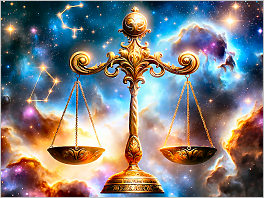61. Photorealistic medium shot of Libra, symbolized as a set of ornate, golden scales balanced perfectly. The scales are suspended in the air by a thread of light, and they float against a background of a cosmic nebula with hues of blues and purples. The constellation of Libra glimmers faintly behind, adding to the harmonious scene.