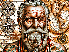 29. Illustration of an elderly man whose skin is etched with intricate tattoos that tell tales of his adventures. His eyes are deep-set and hold a glint of mischief, and his beard is braided with trinkets from distant lands. Against a backdrop of old maps and compass roses, he exudes an aura of a seasoned traveler.