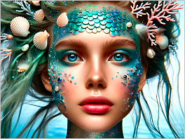 28. Photorealistic image of a young woman with iridescent scales covering parts of her face and neck, giving her an otherworldly mermaid appearance. Her eyes are a deep shade of aquamarine, and her hair flows like seaweed, adorned with tiny shells and pearls. The background is a soft gradient of ocean blues, enhancing her marine allure.