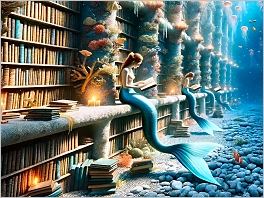 27. Photorealistic portrayal of a serene underwater library. Ancient tomes rest on coral shelves, and merfolk scholars peruse them, their tails shimmering in the filtered sunlight. Schools of colorful fish swim between the aisles, and glowing jellyfish serve as natural chandeliers. The ambiance is one of quiet reflection amidst the deep blue.