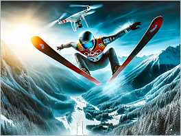 158. A camera is attached to a drone and is taking dramatic pictures of ski jumpers in the air. Sadly the last photo it took was just before a ski jumper crashed into it. Show that picture.