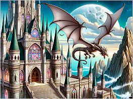 15. A mighty dragon soars through the sky, its wings outstretched, as it glides over a grand castle perched atop a jagged mountain. The castle's spires reach towards the clouds, while its walls are adorned with intricate carvings and shimmering stained glass windows.