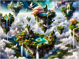 13. Artistic representation of a floating garden in the sky, where islands of verdant greenery drift among clouds. Cascading waterfalls flow from these islands, turning into mist before reaching the world below. Exotic, winged creatures with petals for feathers flit between blossoming trees. At the center of this aerial paradise, a serene pond reflects the tapestry of the heavens, with constellations shimmering on its surface.
