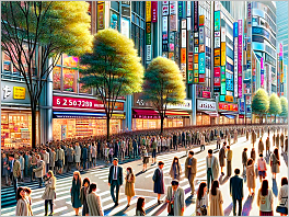 11. Hyper-realistic illustration of a bustling city scene, where the colors are slightly amplified. The crowd's clothing, shop signs, and even the trees seem to have a touch more vibrancy, creating a lively yet not overly saturated atmosphere. Sunlight creates brilliant patterns on the pavement, while every minute detail is rendered with sharp clarity.
