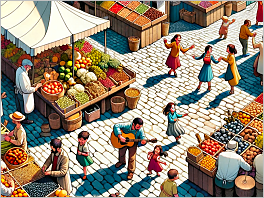 10. Illustration of a lively farmers market scene. Colorful stalls overflow with fresh produce, and the vendors' animated voices resonate through the air. The aroma of spices and fruits is palpable. Further back, a musician strums a guitar, adding a melodic touch. Children playfully navigate the crowd, their movements swift and cheerful. Above, the light casts contrasting shadows on the cobblestones, adding depth to the scene.