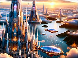 9. Photorealistic image of a floating city above the clouds. Majestic towers made of crystal rise, reflecting the hues of the sunset. Airships, resembling ornate fish, navigate between the towers. Below, the sea of clouds moves and shifts, with occasional peaks of mountains piercing through. Birds with iridescent feathers soar, creating arcs of color in the sky.