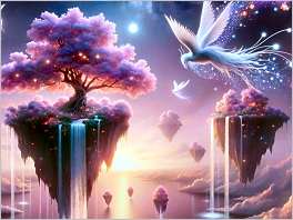 8. Photorealistic image of a serene dreamscape where floating islands drift gently in a lavender sky. Waterfalls cascade from these islands into a shimmering sea below. Ethereal creatures, resembling a blend of birds and fish, glide gracefully through the air, leaving trails of sparkling stardust. Amidst this, a solitary tree on one of the islands blossoms with flowers that emit a soft, luminescent glow, illuminating this fantastical world.