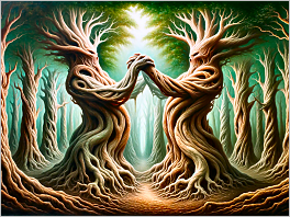 7. Oil painting of a mysterious forest where two colossal trees with human-like forms are the central figures. Their contorted trunks and snaking branches intertwine in an intense dance. The scene is charged with an ominous energy as the trees seem locked in a timeless battle.