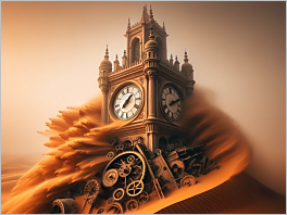 6. Photo of a grand clock tower amidst a desert. Sand, caught in a dance, encircles the tower. The clock, with its wildly spinning hands, contrasts with the desert's stillness. The tower's rusting gears and machinery are exposed. Bathed in an orange haze, the scene captures a singular moment in time, creating a dreamscape where time seems both frozen and fluid.