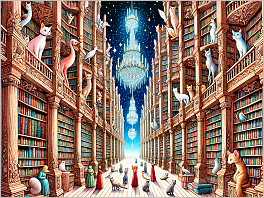 5. Illustration of an endless library that stretches beyond the horizon, with towering bookshelves carved from enchanted wood. These shelves hold books that are alive, their pages fluttering and whispering tales from realms unknown. Curious creatures, a blend of feline and avian, act as librarians, guiding visitors to stories they seek. In the heart of this library, a grand crystal chandelier hangs, powered by captured starlight.