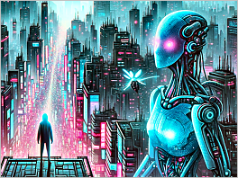 4. Artistic representation of a cyberpunk-inspired city, where the palette is dominated by neon blues and pinks. Robots, characterized by glowing eyes and visible cables, share the streets with humans. The skyline features massive corporate towers, their signs glowing in the smog-filled atmosphere. At the zenith of this urban jungle, a lone individual, enshrouded in a static haze, stands, gazing at the dystopian world beneath.