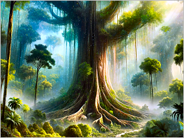 2. Illustration of a mesmerizing tropical rainforest, bathed in mist and teeming with life. The sounds of nature, from chirping birds to rustling foliage, permeate the air. At the heart of this scene stands a majestic tree, its trunk contorted and ancient, rising to support a thick canopy of vibrant greenery. This canopy diffuses the sunlight, casting shimmering patterns on the ground below. The environment is saturated with humidity, adding to the sense of primordial enchantment.