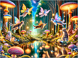 135. The whimsical scene where winged cats flutter through an enchanted forest filled with oversized mushrooms and glowing flowers, capturing a wider view of the enchanted setting.