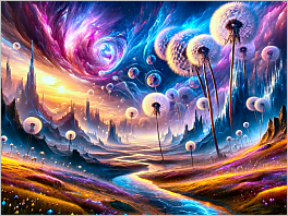 134. The surreal landscape with a vibrant tapestry sky, giant dandelions, a river of liquid gold, and crystal shard mountains, capturing a wider view of this magical setting.