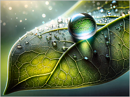 133. Here's the landscape mode image capturing a macro shot of a single raindrop on a leaf after a fresh downpour, with detailed textures and soft highlights, set in a wider view of the natural setting.