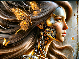 131. photo, portrait of beautiful cyborg with brown hair, intricate, elegant, highly detailed, majestic, digital photography, surreal painting gold butterfly filigree, broken glass, masterpiece, side lighting, finely detailed beautiful eyes. realistic, high definition