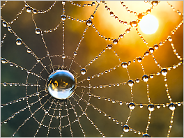 99. A photorealistic close-up of a dewdrop-covered spiderweb in the morning sun