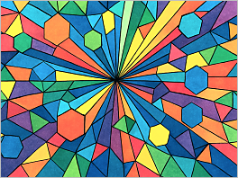 98. A geometric explosion of hexagons, triangles, and lines in rainbow colors