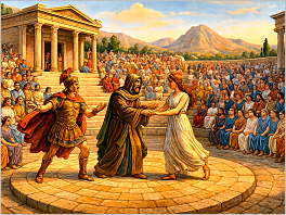 96. An ancient Greek amphitheater in use with actors in traditional costume