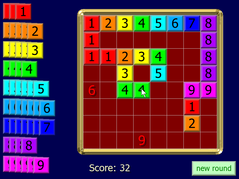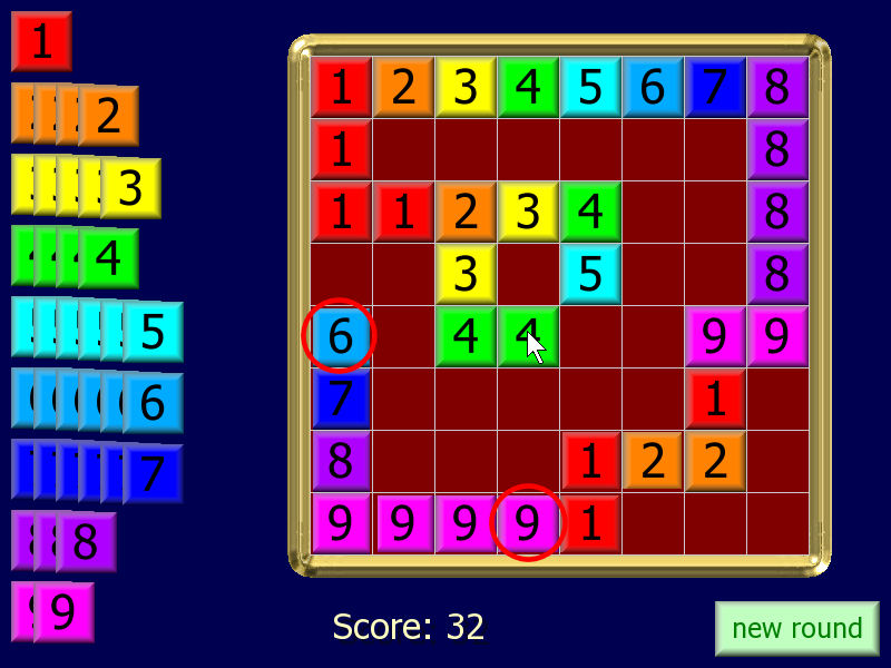 All you have to do is place a tile on its number to score BUT after the first tile is placed, tiles must always be in sequence across or down the screen. To make it a little easier, tiles may also repeat. Here's a picture of a game in progress. Note that when you get to 9 you can start again at 1. Can you work out how to score both the unused 6 and 9 in my picture? (Solution) |